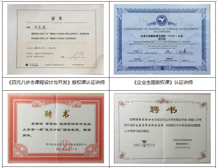 國家認證生涯規劃師、生涯咨詢師,新精英企業生涯版權課認證講師,“畢老師” 校園就業指導中心生涯導師、武漢洪山區大學生就業“卓越人才”生涯導師,華中農業大學“藍天計劃”生涯導師等,多次被聘請到各企業和高校進行生涯輔導工作。