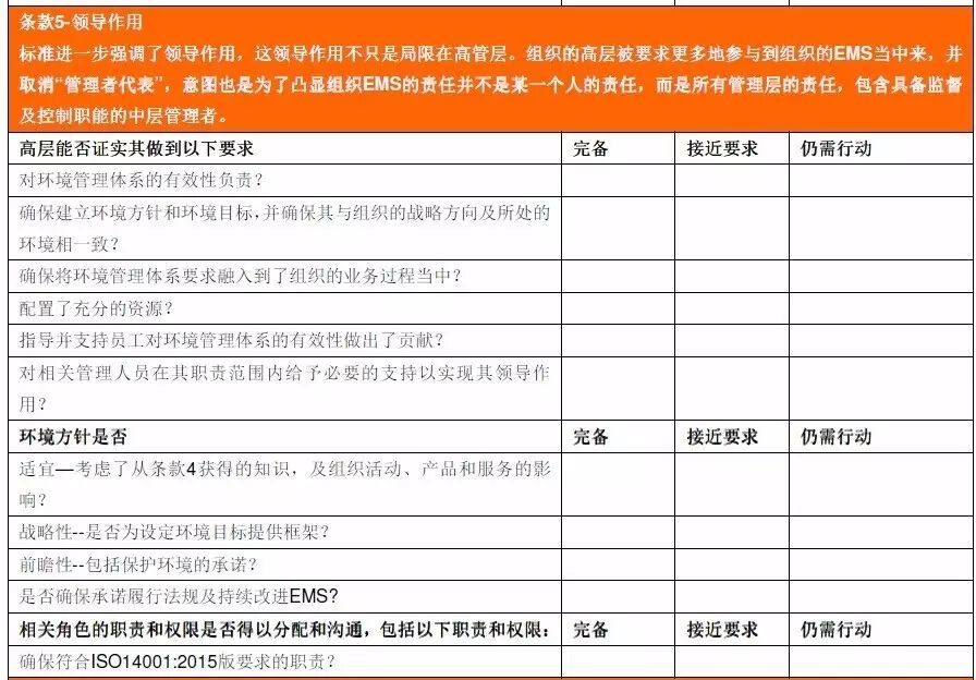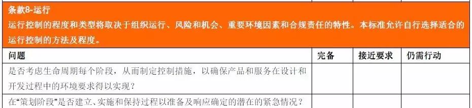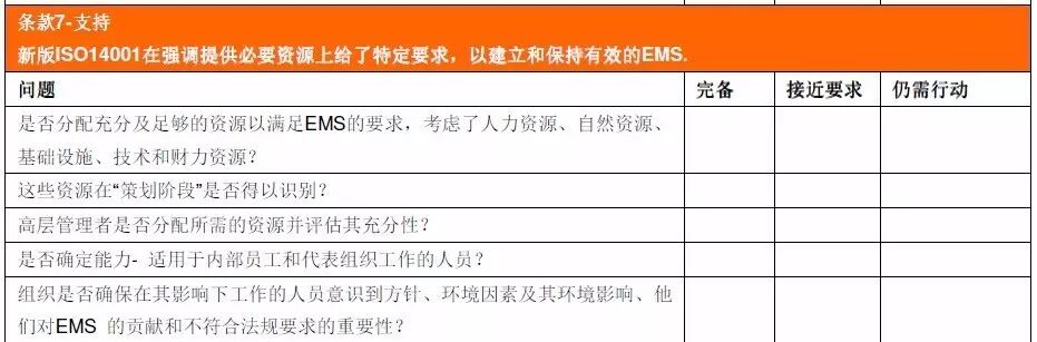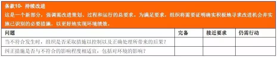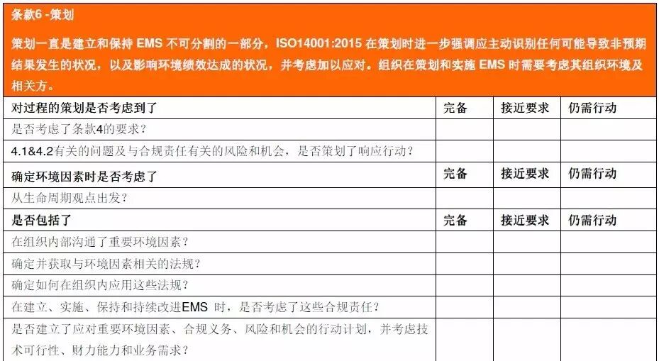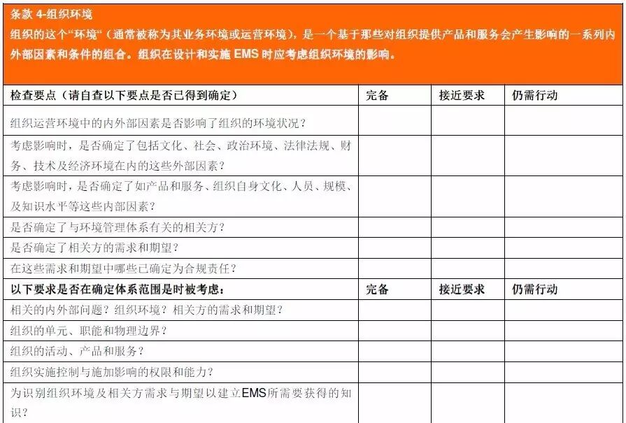 一份新版ISO 14001轉版自檢表,拿走不謝!ISO 14001轉版自檢表究竟如何使用呢?ISO 14001轉版自檢表基于新版ISO 14001標準的條款框架分別編制了相應的關鍵檢查要點。您可以直接將檢查要點中所提出的要求與企業實際情況做對比,并選擇合適的選項標記出來。有三種選項可供選擇,分別是: 完備—選擇這個選項意味著您認為這個要求可以完全被證實已滿足,可以直接被提交認證了。 接近要求—選擇這個選項意味著,您認為在得到一定的指導和支持下,可以被證實滿足這個要求。我們推薦這樣的情況也可以被提交認證。 仍需行動—這個選項意味著還需要進一步的準備工作方能被證實滿足。這些準備工作可能包括必要的培訓和(或)差距評估。 ISO 14001轉版自檢表檢查要點4-組織環境 5-領導作用 6-策劃 7-支持 8-運行 9-績效評價 10-持續改進 以上就是ISO 14001轉版自檢表的全部自測內容, |